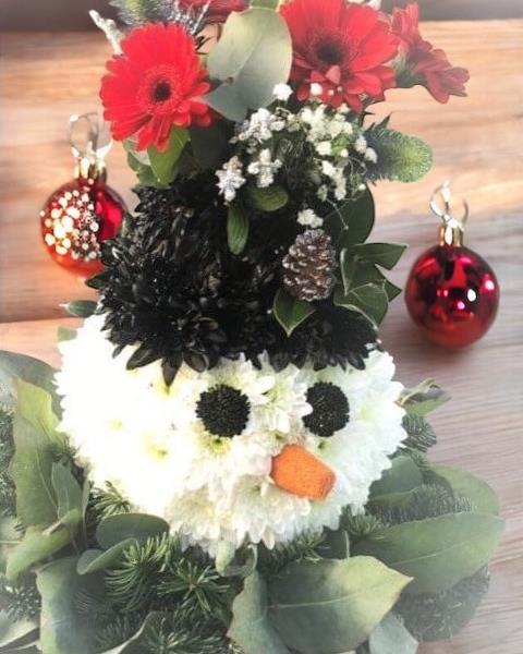 3D Snowman's head with flowers spraying from the hat. Beautiful tribute for a special grave or just for a table at home