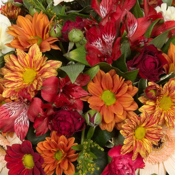 A compact posy arrangement created using seasonal flowers and foliage. Available in autumnal shades as pictured or a range of different colours.