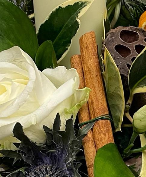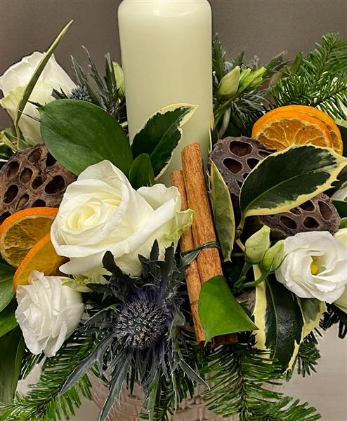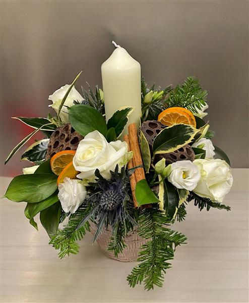 Lovely table centre set in a rustic ceramic pot. Features white seasonal flowers, festive foliages, decorations and a chunky church candle.