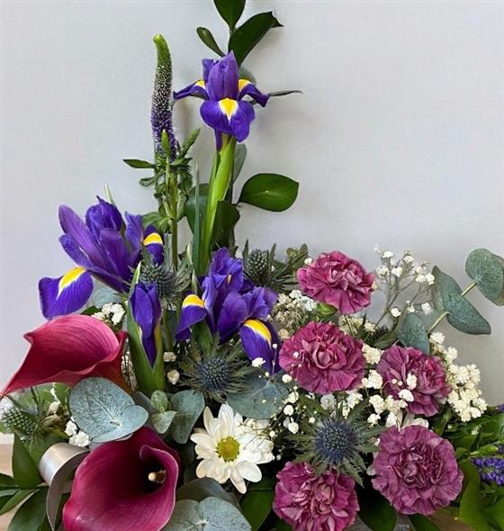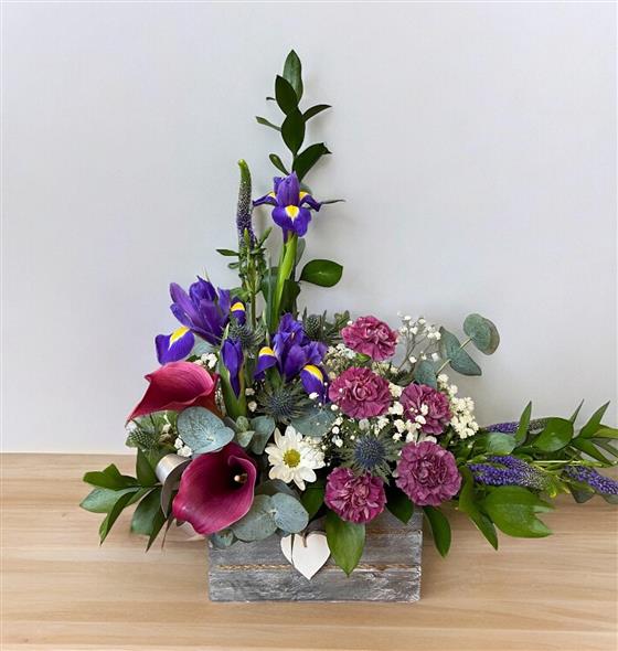 Arrangement of purples & mauves designed in wet floral foam in a stylish wooden crate