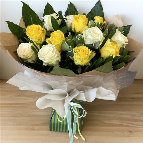 A dozen best quality yellow & white roses presented with a selection of foliage presented in water & gift box.
