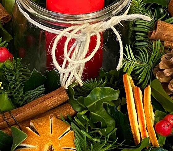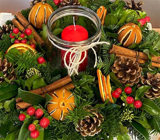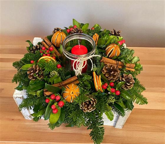 This classic seasonal arrangement of noble fir, berried holly, orange slices, cinnamon and berries, makes a traditional centrepiece for your Christmas table. Product shown is large