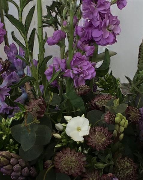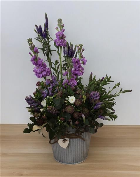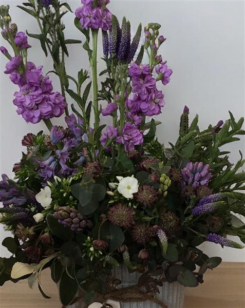 A purple hedgerow scooped up and arranged in wet foam in a faux zinc or ceramic container.