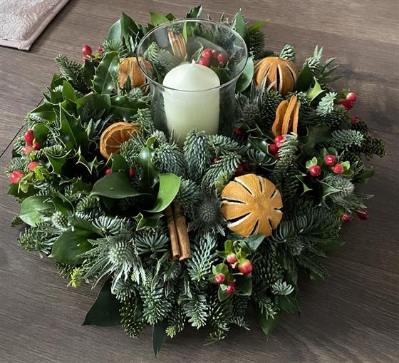 This elegant arrangement circling a candle in a vase, made with noble pine, dried whole oranges & orange slices, with cinnamon, cones & red berries , makes a lovely traditional centrepiece for your Christmas table.