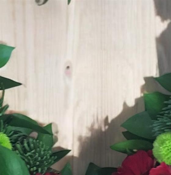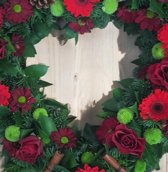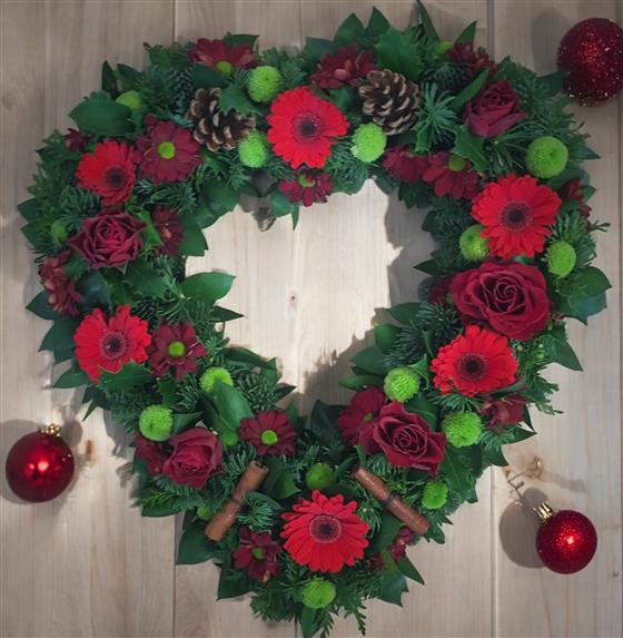 Open heart with winter foliage, red mixed flowers, cinnamon, sticks & cones